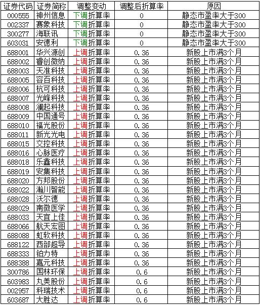 自2019年10月28日起,将瑞茂通(600180)、济民制药(603222)调出可充抵保证金证券范围,并对可充抵保证金证券折算率做如下调整: