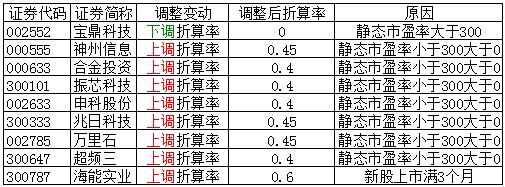 根据《长城证券股份有限公司融资融券业务担保物管理办法》的相关规定,今日将贝斯美(300796)调入可充抵保证金证券范围,将三达膜(688101)、联瑞新材(688300)调入可充抵保证金证券范围及融资标的证券范围,将博瑞医药(688166)的融资保证金比例调整为1.3。且自2019年11月18日起,对可充抵保证金证券折算率做如下调整: