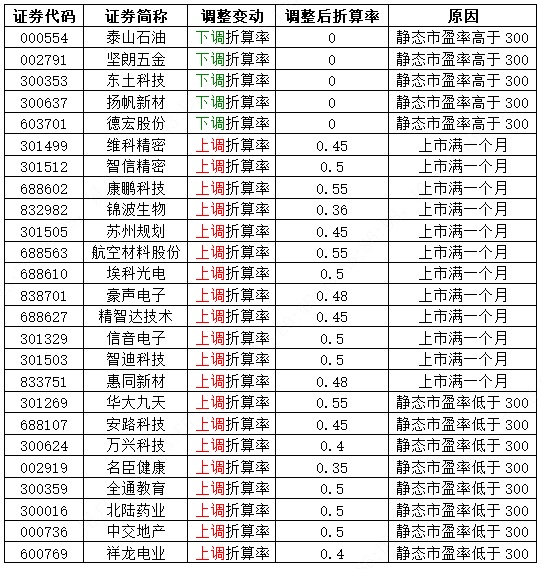 根据《长城证券股份有限公司融资融券业务担保物管理办法》的相关规定,今日将威马农机(301533)、锴威特(688693)调入可充抵保证金证券范围和融资标的证券范围,将宏裕包材(837174)、皇台酒业(000995)、粮食ETF(159698)、燃23转债(113067)、信服转债(123210)、东宝转债(123214)调入可充抵保证金证券范围,另外,自2023年8月21日起,对可充抵保证金证券折算率进行调整,调整名单如下: