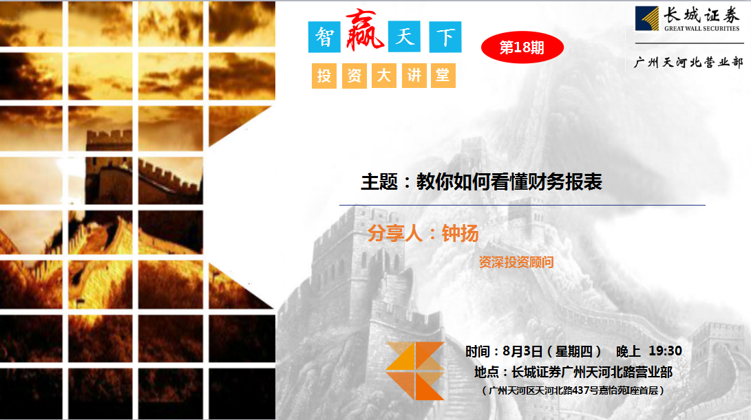 8月3日(星期四)晚上7:30到8:30我部财富管理中心资深投资顾问钟扬将在营业部做主题为《教你如何看懂财务报表》的投资讲座,欢迎各位投资者莅临倾听。