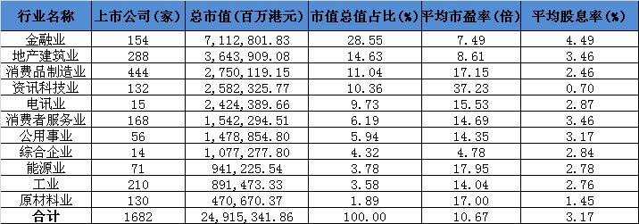 在港上市的企业分布各行各业,其中占市值最高的前三位分别为金融业、地产建筑业和消费品制造业。