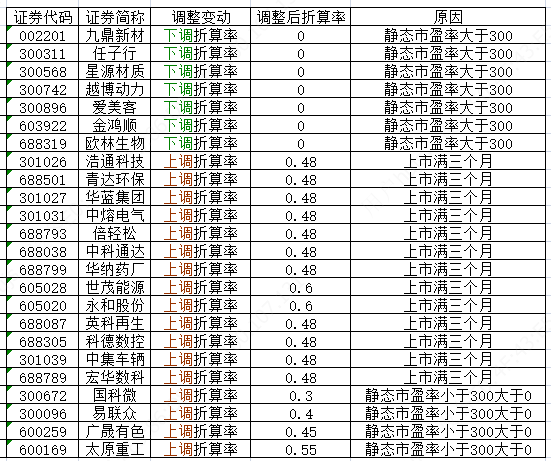 根据《长城证券股份有限公司融资融券业务担保物管理办法》的相关规定,今日将珠海冠宇(688772)调入可充抵保证金证券范围和融资标的证券范围,将丽臣实业(001218)、科技龙头ETF(159723)、科技100ETF(159853)、机器人50(562360)调入可充抵保证金证券范围。另外,自10月18日起,对可充抵保证金证券折算率做如下调整: