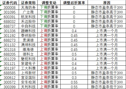 根据《长城证券股份有限公司融资融券业务担保物管理办法》的相关规定,今日将嘉曼服饰(301276)、通行宝(301339)、信德新材(301349)、华大智造(688114)调入可充抵保证金证券范围和融资标的证券范围,将嘉华股份(603182)、MSCIESGETF(159621)、成渝经济圈ETF(159623)、沪深300成长ETF(562310)调入可充抵保证金证券范围,另外,自2022年9月13日起,对可充抵保证金证券折算率做如下调整: