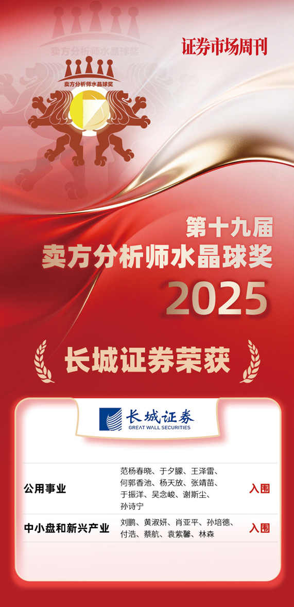 12月26日,第十九届(2025)“卖方分析师水晶球奖”评选结果揭晓,长城证券产业金融研究院公用事业团队和中小市值团队在本次评选中同时入选“总榜单”与“公募榜单”,再次实现双榜入围。