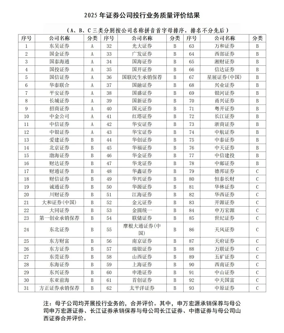 投行业务质量评价是对证券公司投行业务的综合性评价,统筹考虑了股票保荐、债券承销、并购重组财务顾问和股转公司(北交所)等四类投行业务的开展情况。根据中证协官网发布的情况,在评价期2024年1月1日至12月31日内开展投行业务的93家证券公司中:A类12家、B类66家、C类15家。