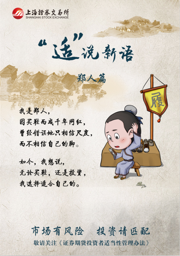 宁(nìng)信度,无自信也!上交所借了“郑人买履”这个经典故事,旧瓶装新酒,想告诉大家,投资前要做到先“了解自己”,先得知道自己的“脚”多大, 做好自己的风险测评,才能在市场上找到合适的投资产品。